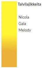 Käyttö: Kaunis kirkaskuorinen yleisperunalajike, jonka malto kirkkaan keltainen. Sopii pakkaamoille ja kuorintaan. Nopea kasvurytmi ja kuoren muodostuminen. Herkullinen maku!